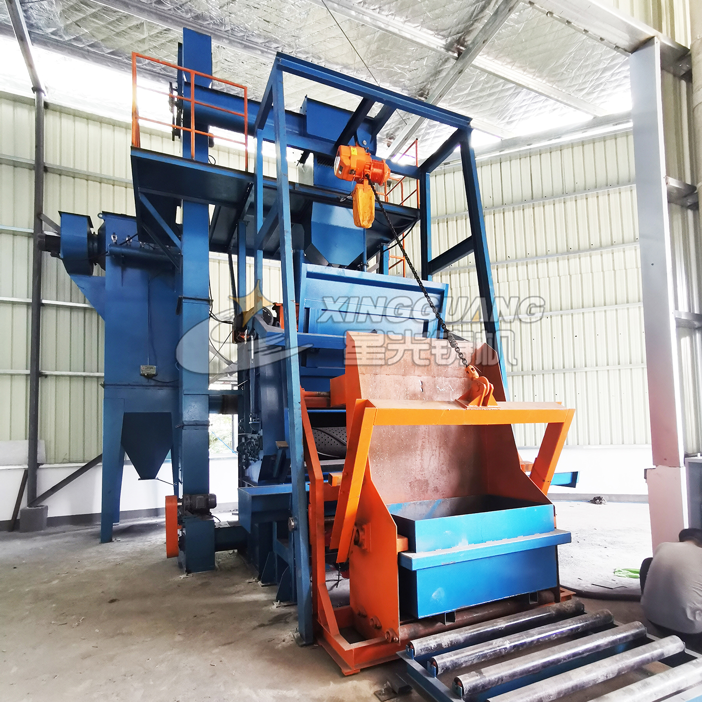 采用滾筒機構,配置高效拋丸器,鋼丸在投射中,滾筒可回轉、上下搖動,工件攪拌不撞擊,彈丸投射均勻??商幚砑毿”〖?、有卡住可能的特殊工件。滾筒機構采用液壓控制,設備工作過程平穩,定位精確。它適用于各行業中...…